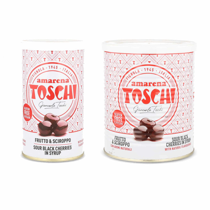 Toschi Sour Black Cherries in Syrup is available in two sizes: