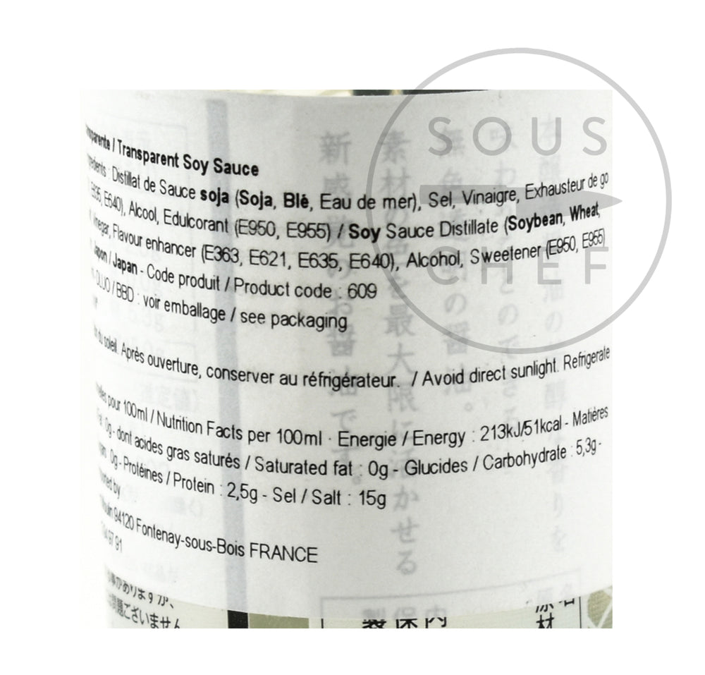 Transparent soy sauce gives your food an umami depth of flavour, while keeping the original colour of the ingredients. Unlike dark soy sauces, this version has been made from distilled soy sauce giving it the transparent appearance. With a deep, rounded flavour, this soy sauce is perfect for seasoning seafood carpaccio and sushi.