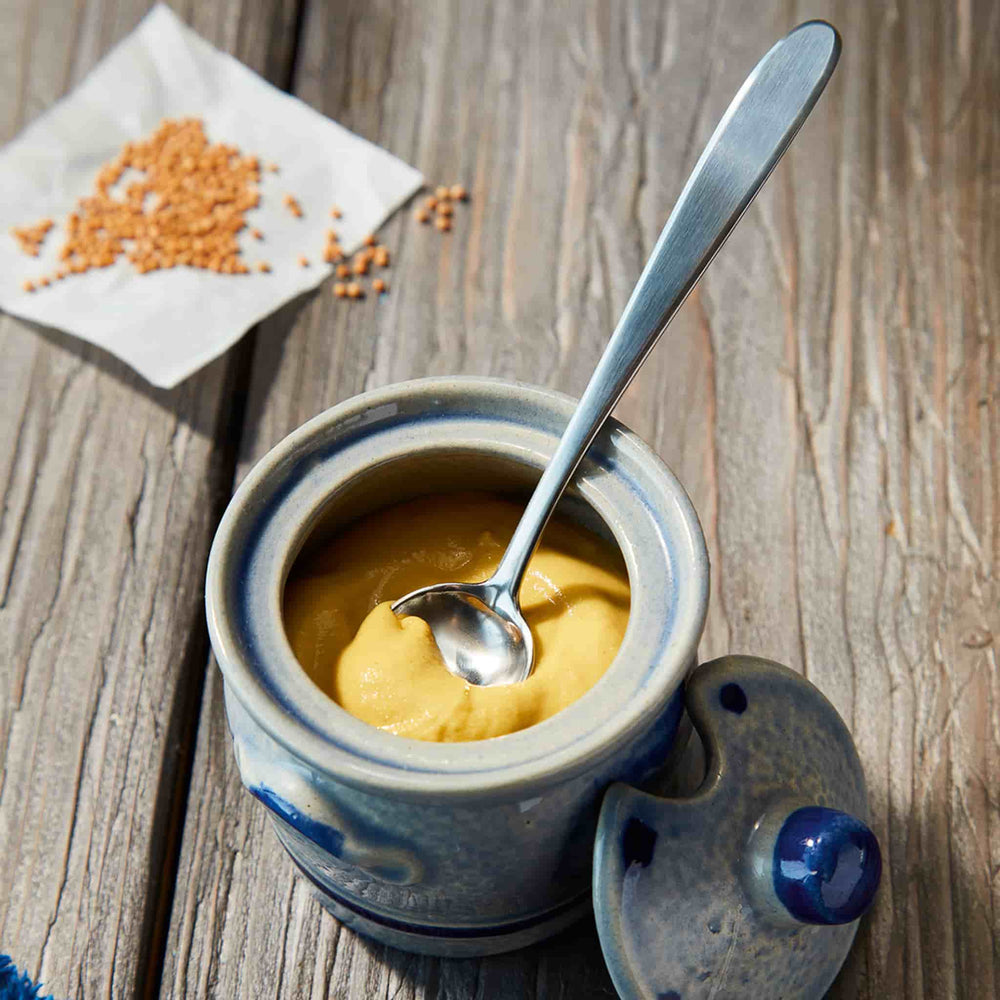 Use this steel spoon to scoop and serve mustard. The small bowl and slender handle can reach inside small and narrow jars. Add a dollop of Dijon or wholegrain mustard to sandwiches or salad dressings.