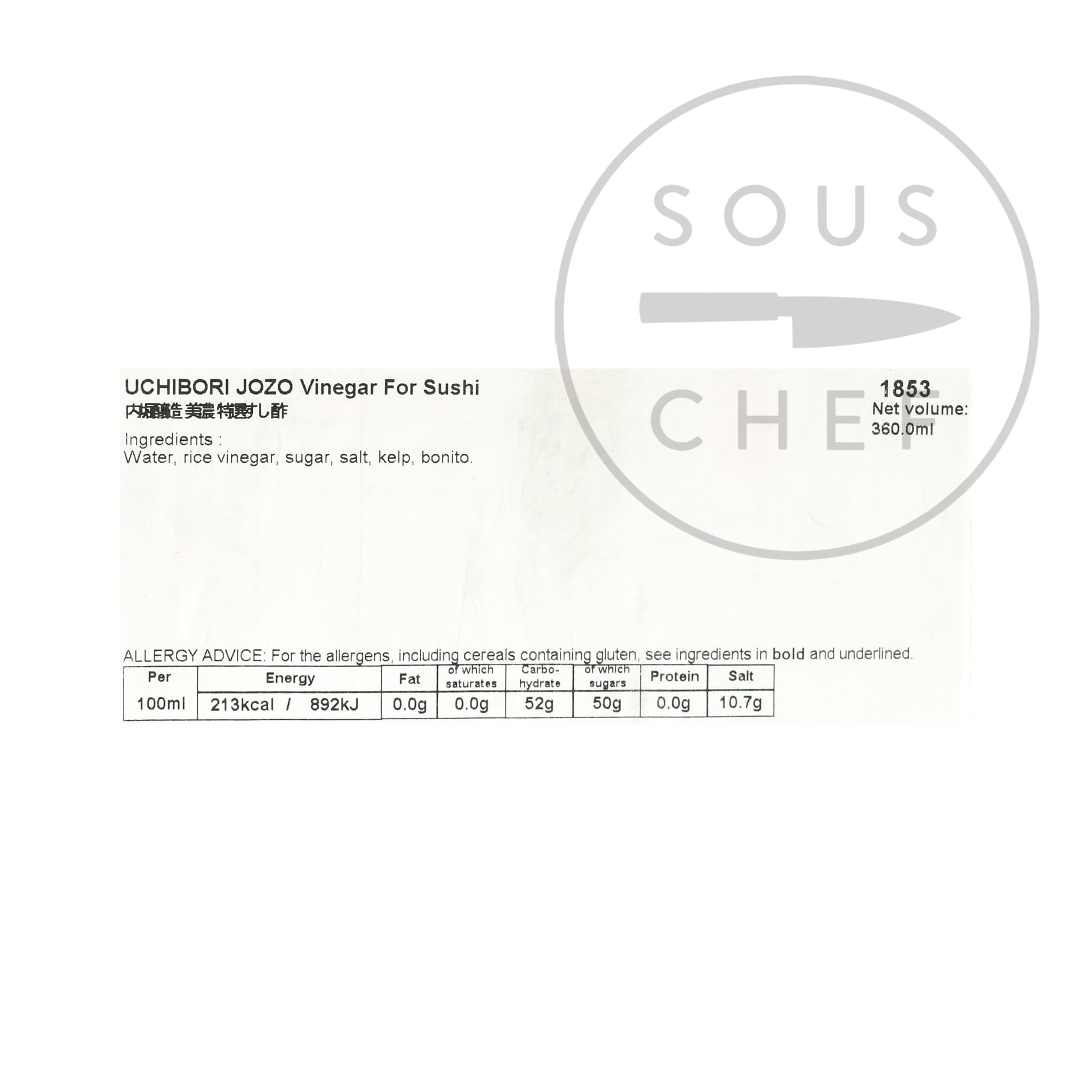 Uchibori premium sushi vinegar is the highest quality sushi vinegar straight from Japan. Uchibori’s use of simple and flavoursome Product formulations and details may change. For the latest ingredients and allergen information always check product packaging prior to consumption. Ingredients: bonito and kelp, along with simple seasonings - salt and sugar - gives it a pure sweet-sour taste that creates the perfect back for other ingredients. This pre-seasoned rice vinegar is the secret to perfect sushi rice.