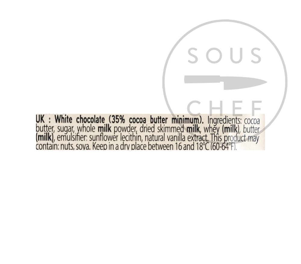 Product formulations and details may change. For the latest ingredients and allergen information always check product packaging prior to consumption. Ingredients: Cocoa butter, sugar, whole milk powder, dried skimmed milk, whey (milk), butter (milk), emulsifier: sunflower lecithin, natural vanilla extract.