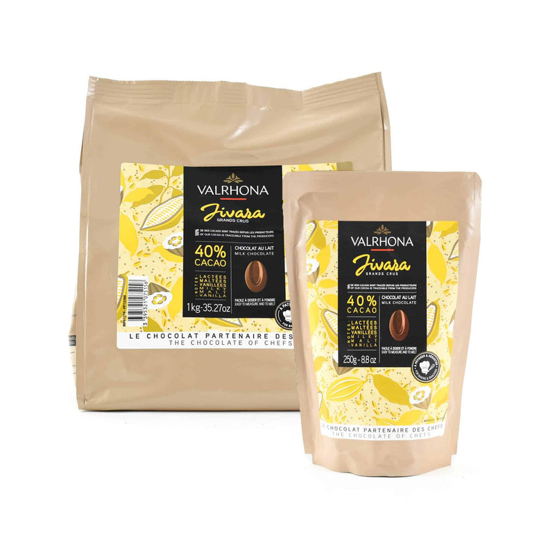 Valrhona Jivara milk chocolate couverture has rich creamy and caramelised notes - with a touch of malt and brown sugar to enhance the complexity of the chocolate. The velvety Jivara chocolate contains a minimum of 40% cocoa solids. The individually moulded couverture chocolate chips are perfect for baking as they're easy to weigh out and very quick to melt with their trademark Valrhona feves or bean shape.