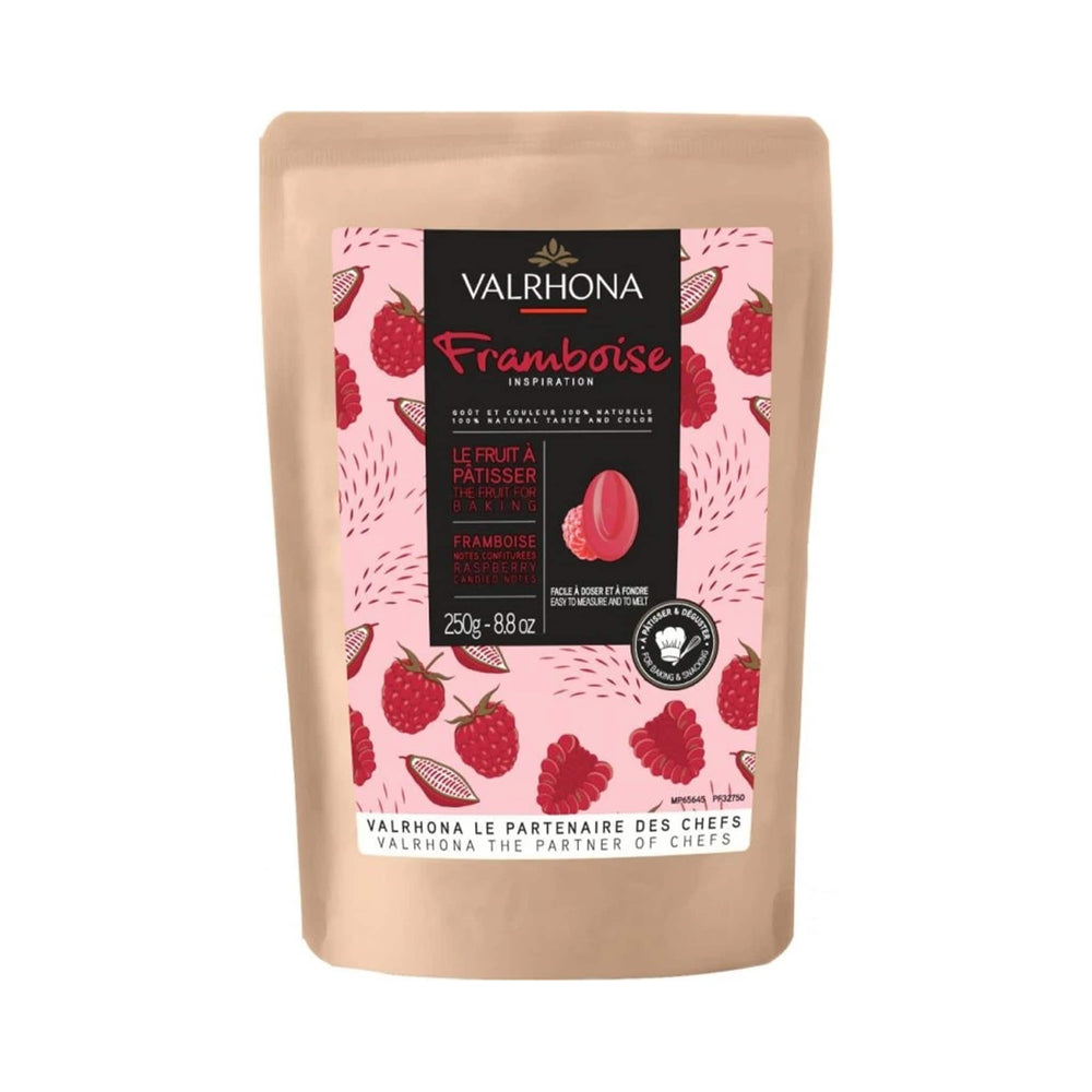 Valhrona Inspiration drops are made with cocoa butter, sugar and raspberry powder. They capture the intense berry flavour of ripe raspberries. Couverture is ideal for tempering, thanks to its high cocoa butter percentage. It melts easily and has an attractive glossy sheen.