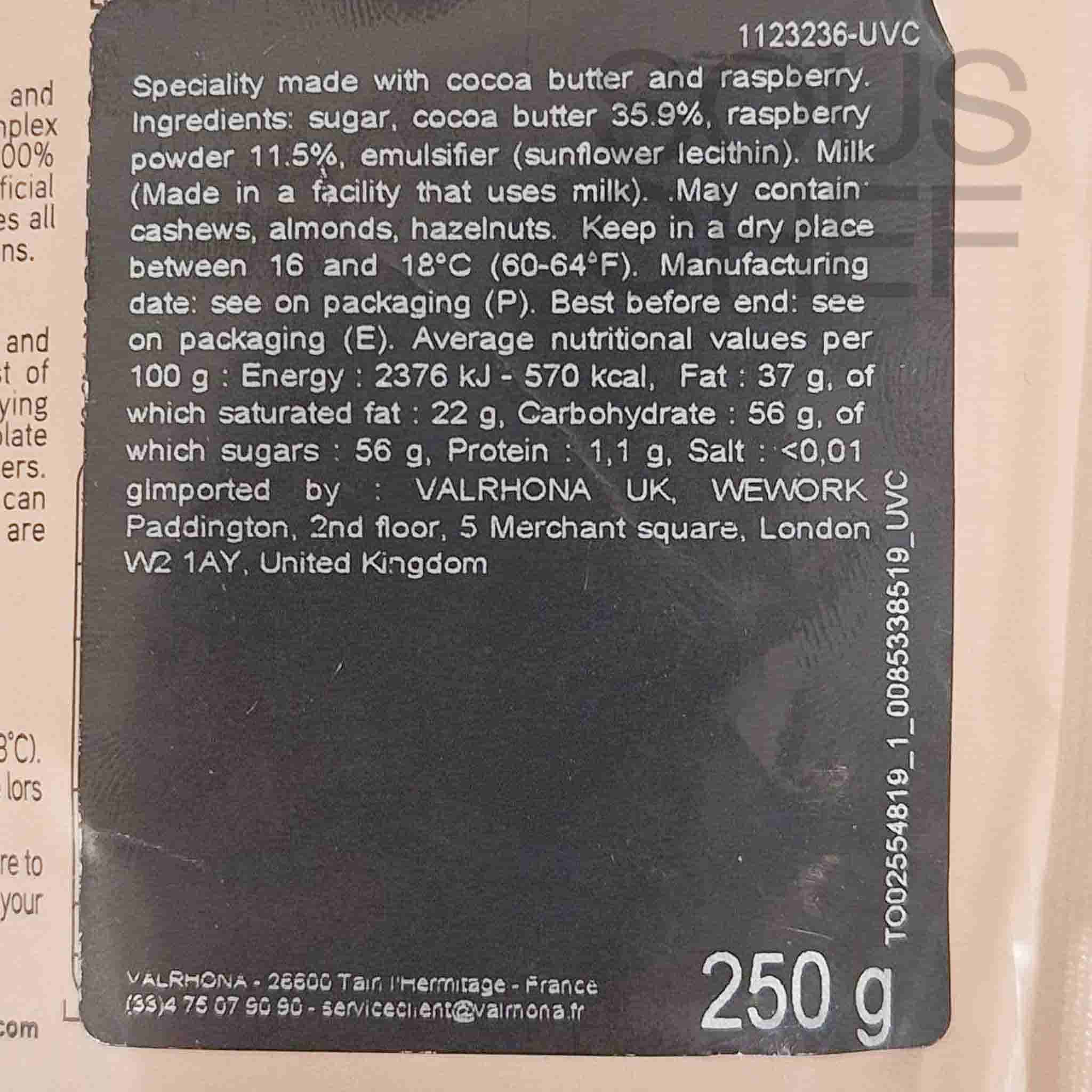 Product formulations and details may change. For the latest ingredients and allergen information always check product packaging prior to consumption. Ingredients: Sugar, cocoa butter 35.9%, raspberry powder 11.5%, emulsifier (sunflower lecithin)