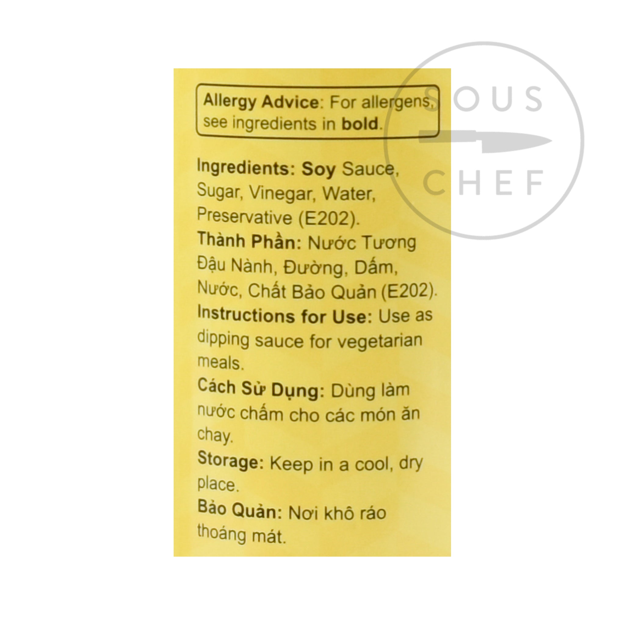 Product formulations and details may change. For the latest ingredients and allergen information always check product packaging prior to consumption. Ingredients: soya bean sauce, sugar, vinegar, water, preservative: E202 (potassium sorbate). Allergens are listed in bold.