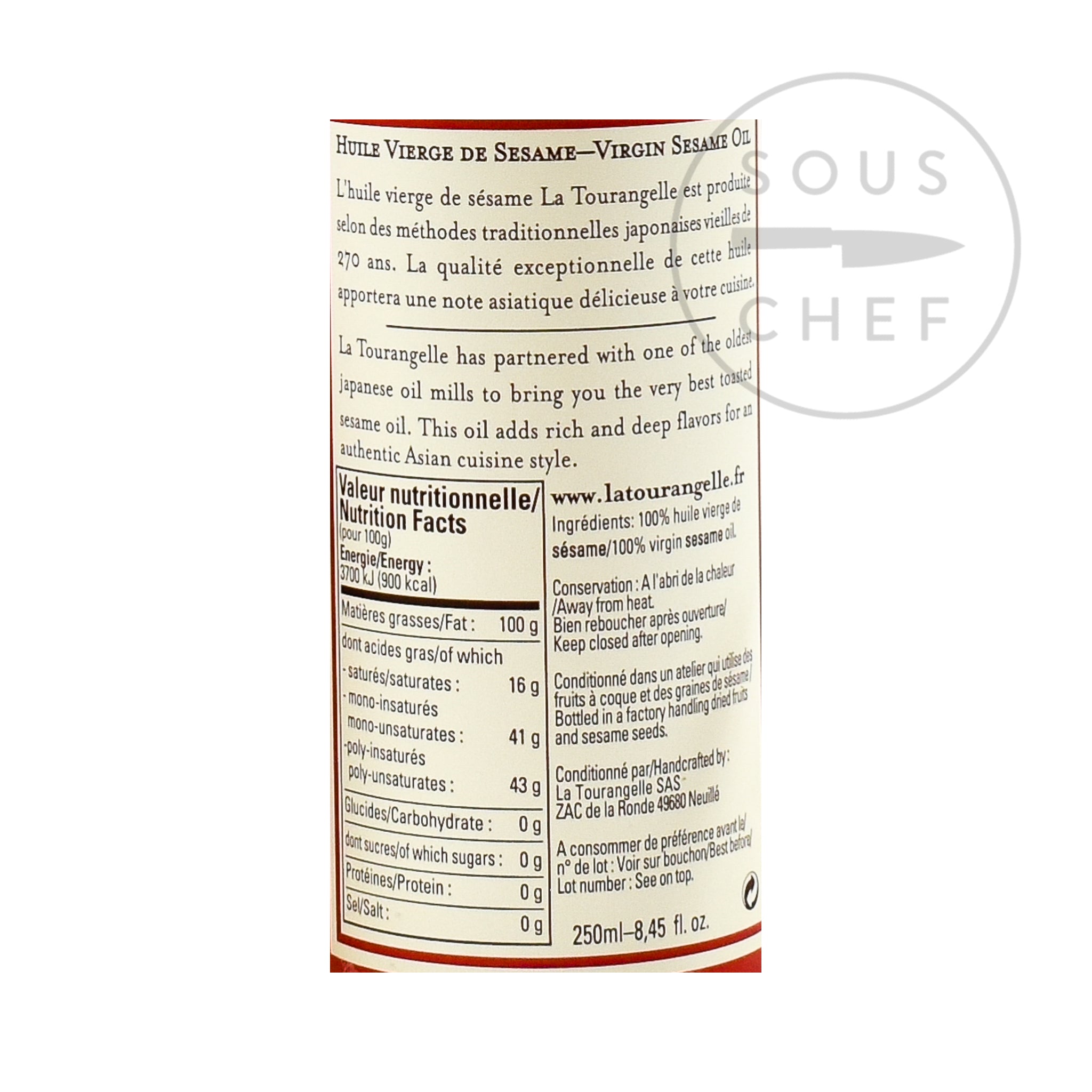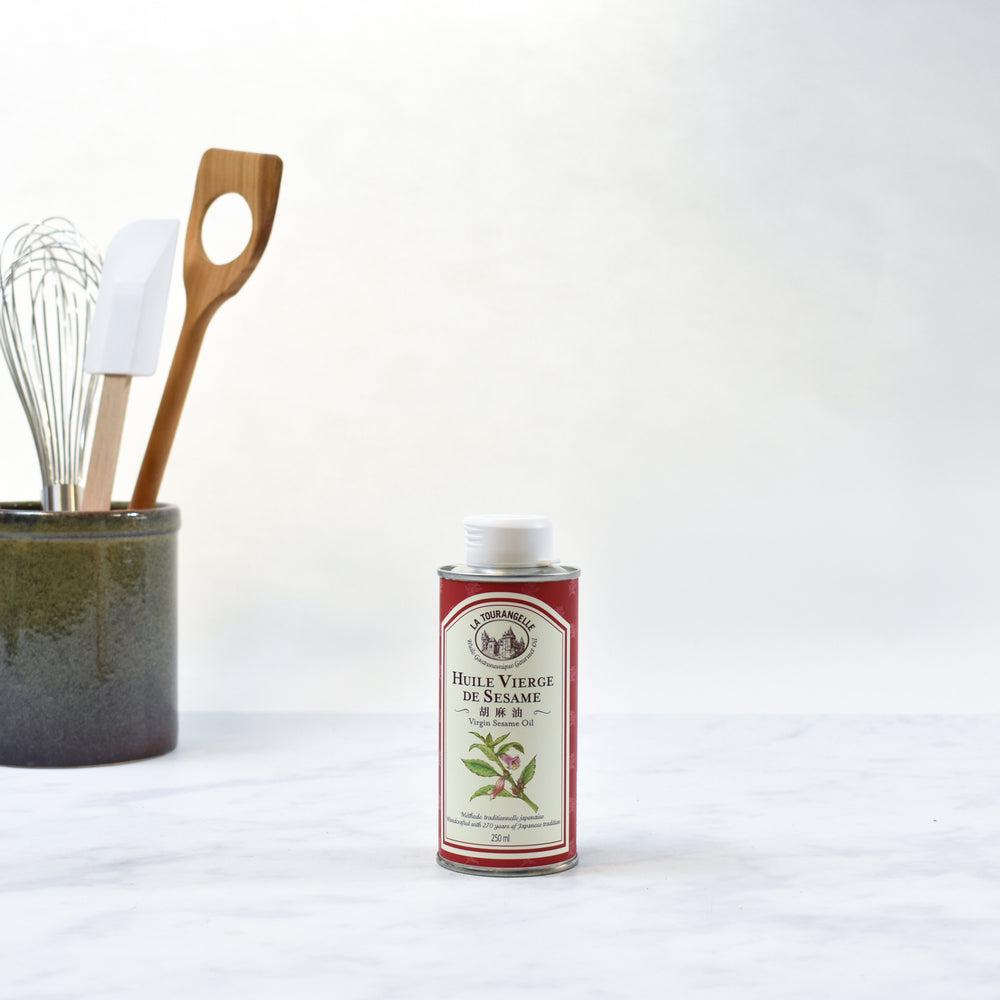 La Tourangelle virgin sesame oil has been hand selected from the best Japanese mills by France's artisan oil producer La Tourangelle. The pure virgin sesame oil is made from 100% pure, roasted, ground, and pressed sesame seeds. The rich, exotic sesame flavours are used in Japanese, Korean and Chinese cooking.
