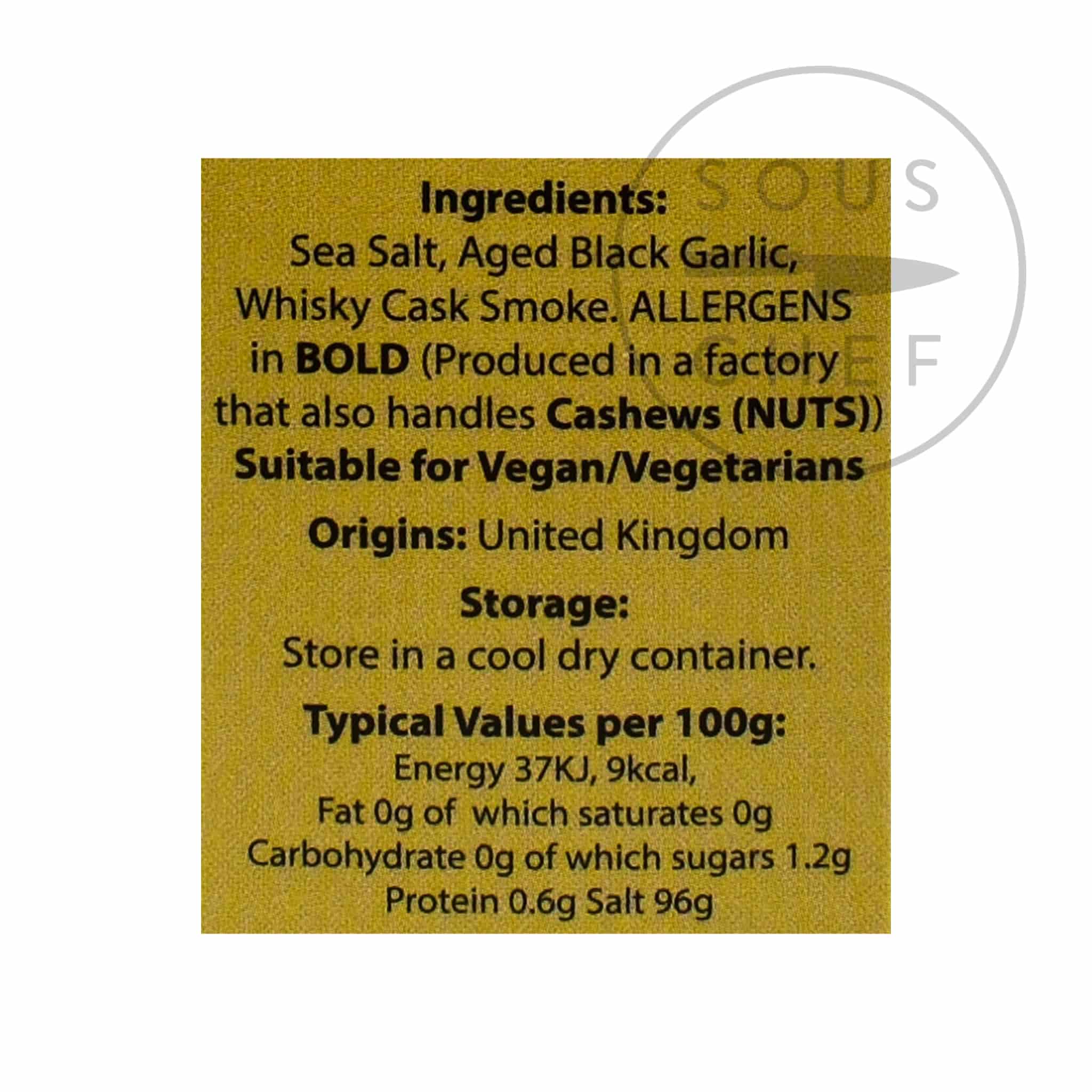 Product formulations and details may change. For the latest ingredients and allergen information always check product packaging prior to consumption. Ingredients: Smoked salt, aged black garlic, whisky oak smoke.