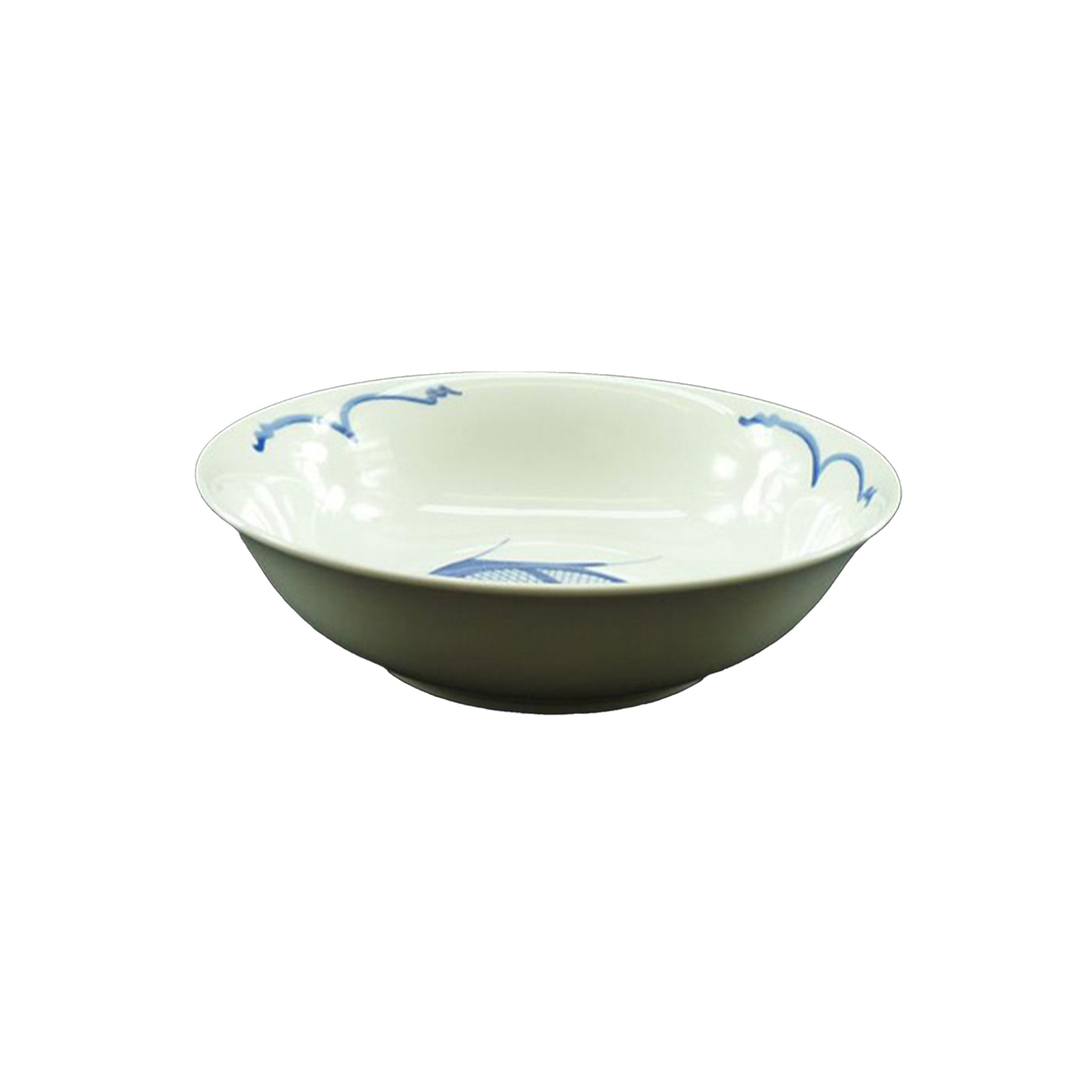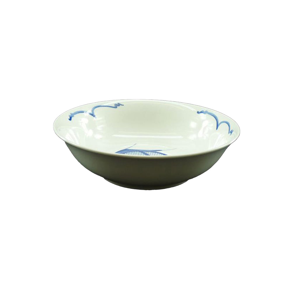This white and blue soup bowl is decorated with a stylised carp design. It’s wide and deep - ideal for ramen and hot and sour soup.