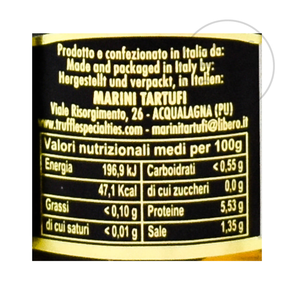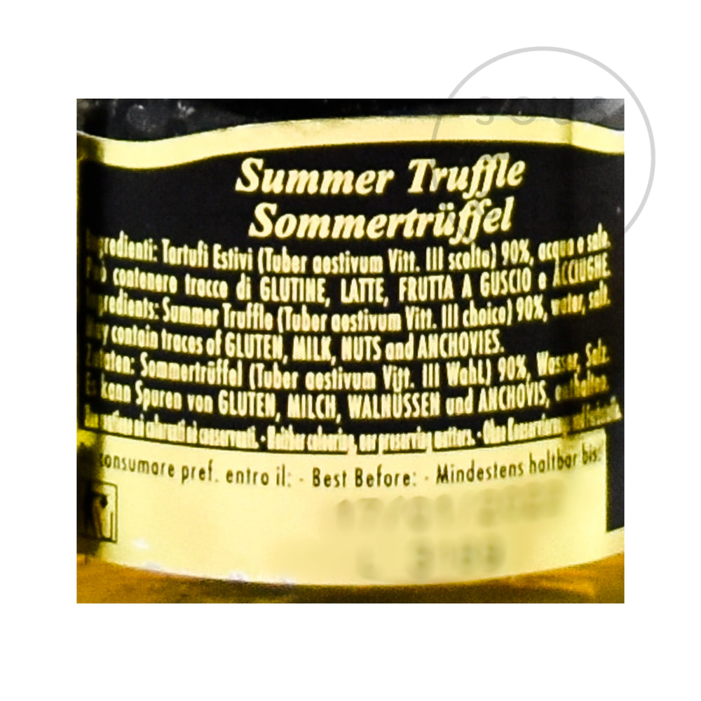 Product formulations and details may change. For the latest ingredients and allergen information always check product packaging prior to consumption. Ingredients: Summer truffle (tuber aestivum vitt), water, salt. May contain traces of gluten, milk, celery, anchovies, nuts.
