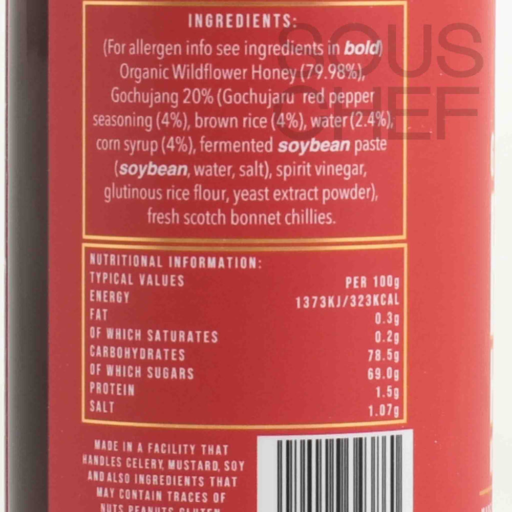 Product formulations and details may change. For the latest ingredients and allergen information always check product packaging prior to consumption. Ingredients: Organic wildflower honey (79.98%), gochujang (20%) (red pepper paste mixed seasoning (4%), gochugaru red pepper powder, salt, garlic, onion, water), corn syrup (4%), brown rice (4%), water (2.4%), fermented soybean paste (soybean, water, salt), isomaltooligosaccharide, salt, spirits, red pepper powder, glutinous brown rice flour, yeast extract powder), scotch bonnet chillies. Handled in a facility that handles celery, mustard, soy. May contain traces of nuts, peanuts, gluten, egg, milk, fish, sesame and sulphites.