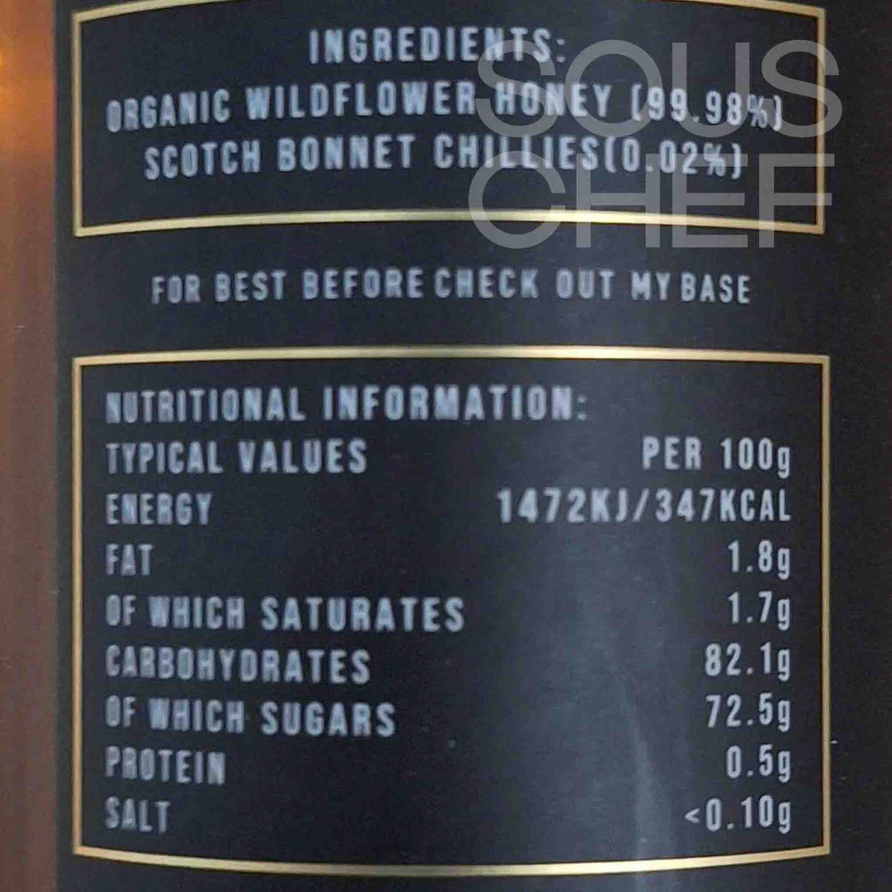Product formulations and details may change. For the latest ingredients and allergen information always check product packaging prior to consumption. Ingredients: Organic wildflower honey, scotch bonnet chillies (trace). Handled in a facility that handles celery, mustard, soy. May contain traces of nuts, peanuts, gluten, egg, milk, fish, sesame and sulphites.