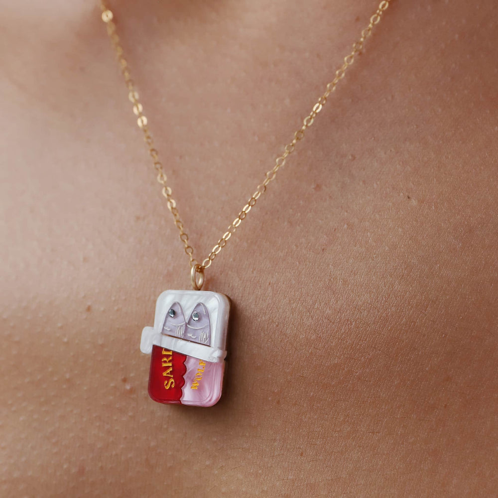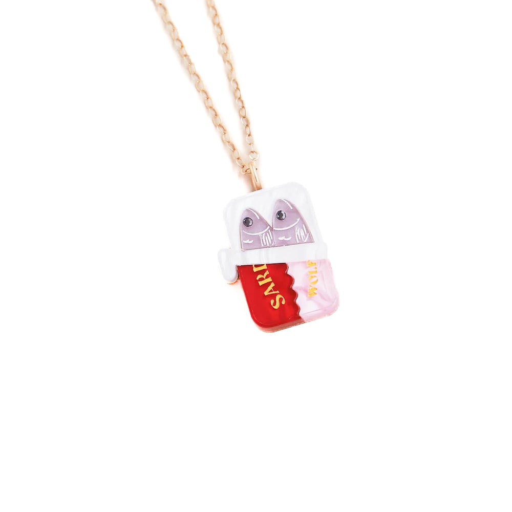 Tap into the tinned fish trend with this funky sardine necklace. Designed by Wolf & Moon, the pendant resembles a red and pink tin with gold lettering. Nestled inside are silver sardines with crystal eyes.