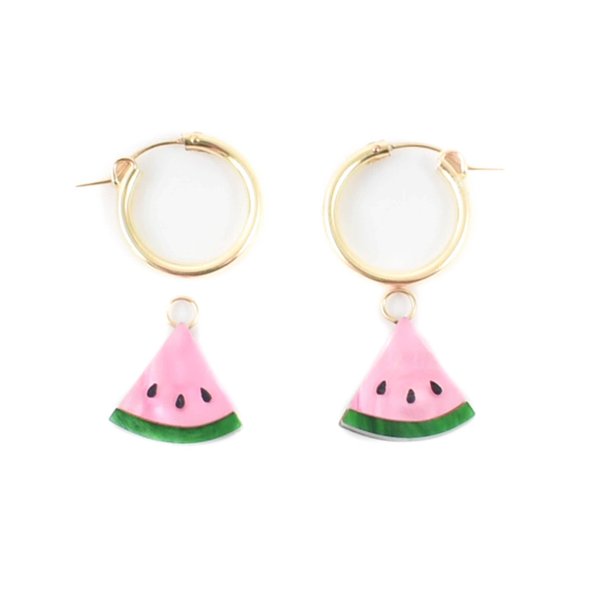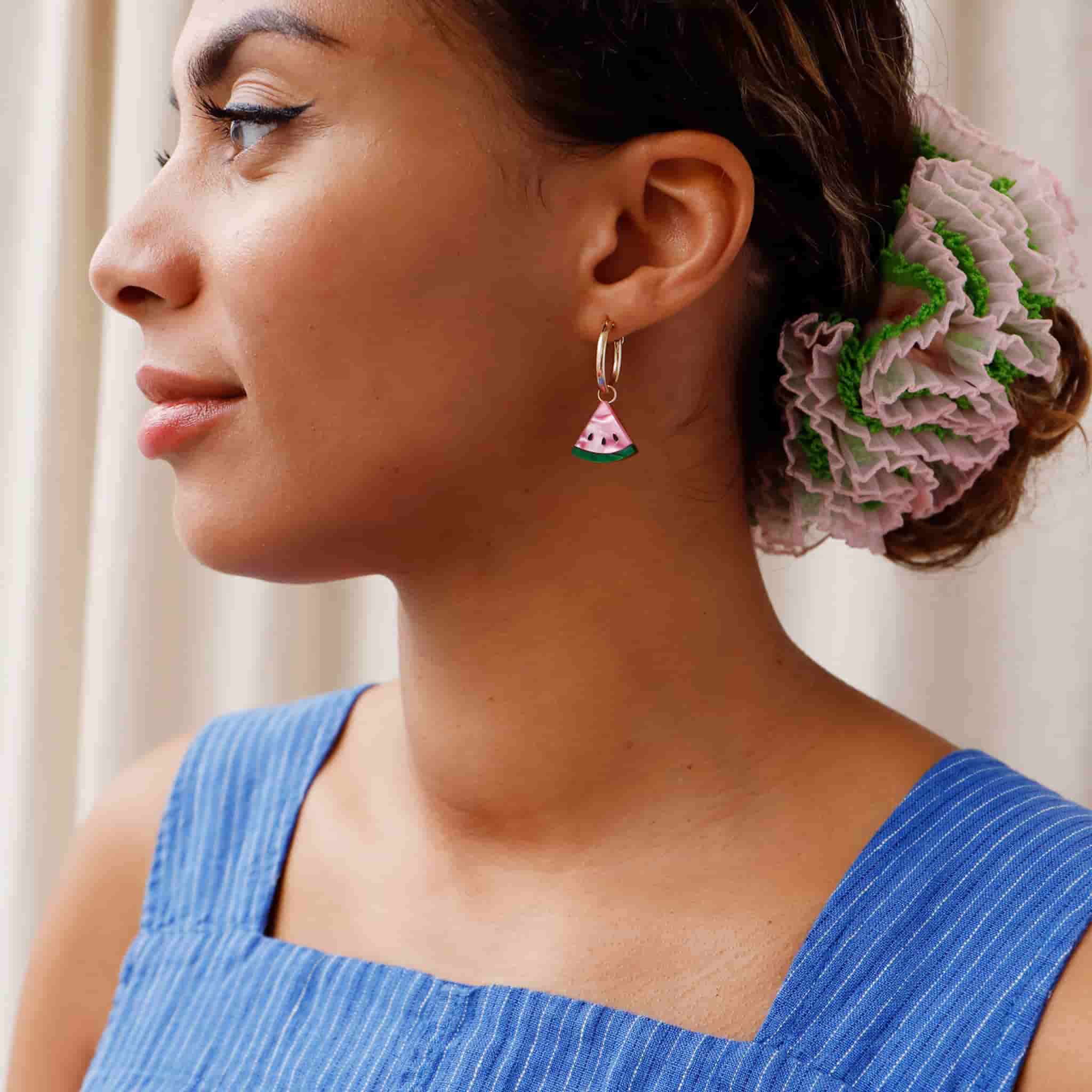 These handcrafted watermelon hoop earrings are perfect for beach parties and summer holidays. Designed to look like juicy wedges of watermelon, each charm is made from FSC-certified wood with delicate hand-inked details. Suspended from gold-filled hoops, the hot pink and bright green charms will add a pop of colour to any outfit.