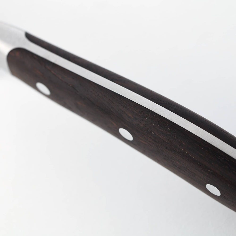 Where the Classic Ikon has a black plastic handle, the Ikon range has a more luxurious handle made from African Blackwood. Known for it's dark brown colours, it is also a very dense wood and water resistant, making it very durable, and excellent to use as a knife handle.