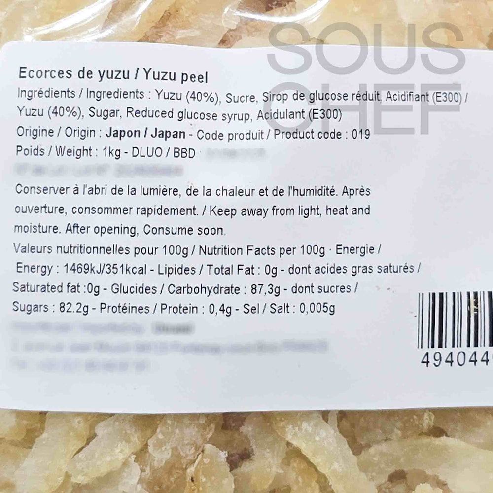 Candied yuzu peel adds a burst of citrus flavour to biscuits and desserts. It has a sweet-sharp flavour similar to grapefruit and mandarin. Enjoy it straight from the bag or use it to garnish cakes and éclairs.